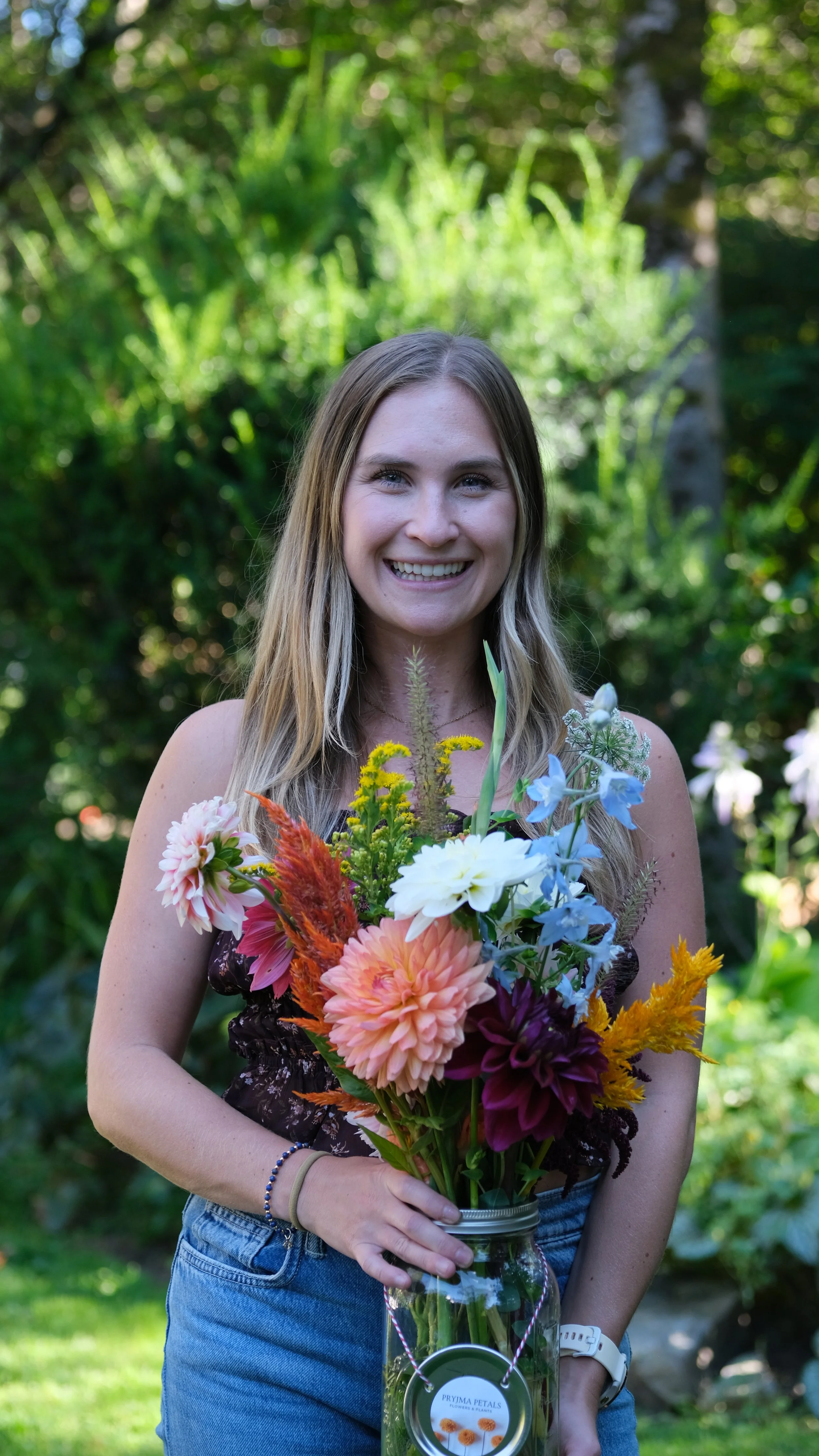 “I live right down the road from Luke and Britta and have been purchasing their beautiful bouquets since last year. Their dahlias are amazing and the additions of zinnias and gladiolas create magic in a jar!”